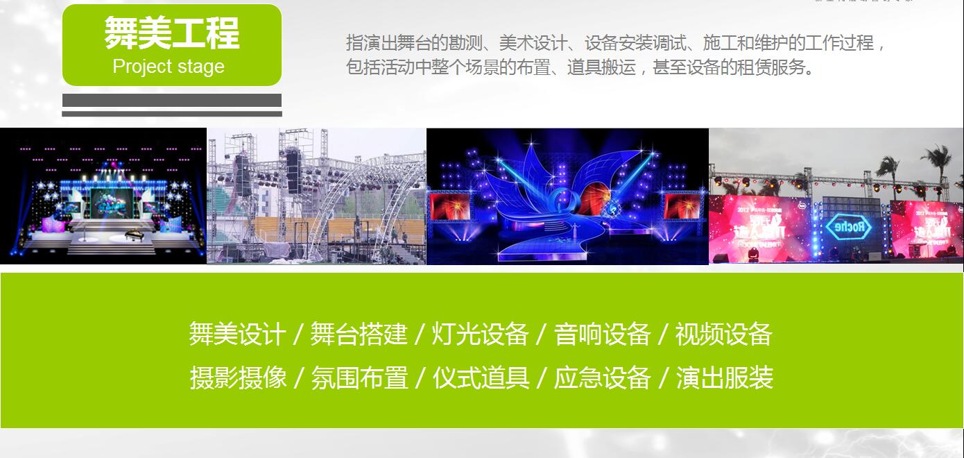指演出舞台的勘测、美术设计、设备安装调试、施工和维护的工作过程,包括活动中整个场景的布置、道具搬运,甚至设备的租赁服务。 【服务范围】舞美设计 / 舞台搭建 / 灯光设备 / 音响设备 / 视频设备 / 摄影摄像 / 氛围布置 / 仪式道具 / 应急设备 / 演出服装 / 物料套餐